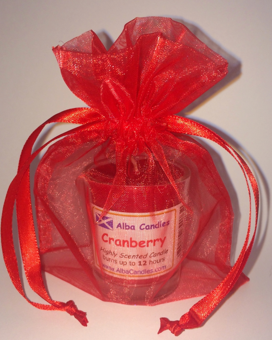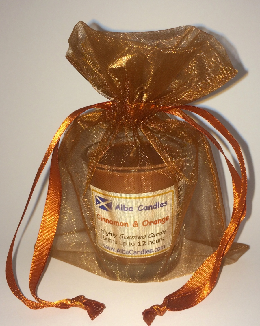 Frankincense & Myrrh, Cinnamon & Orange, Mistletoe, Cranberry, Vanilla or Xmas Spice highly scented candle, coloured organza gift bag    £6