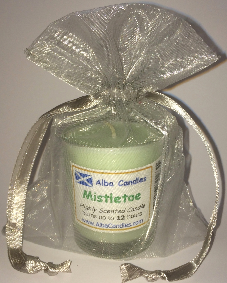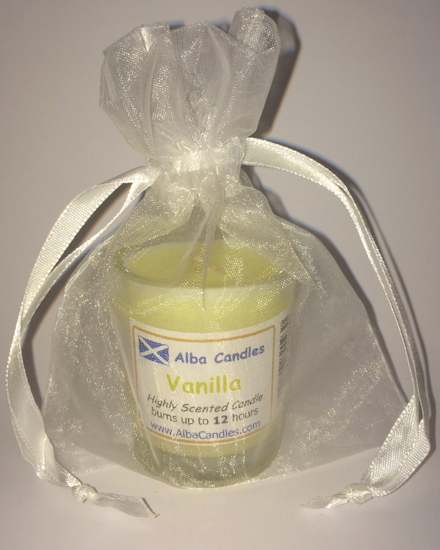 Scented Alba Candles in a shot glass in an organza bag for Christmas - £6 each, £30 for all six