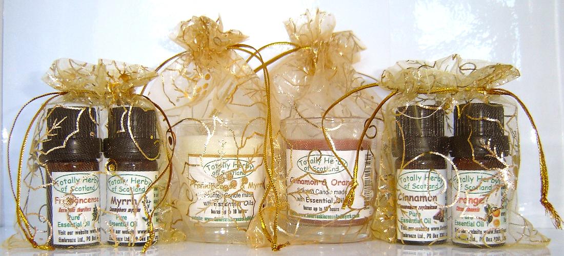 with Frankincense and Myrrh, Cinnamon and Orange, essential oils and candles. For Christmas, Gold Frankincense and Myrrh, the gift bag! A 5ml bottle of frankincense essential oil & one of myrrh, in a gold organza gift bag with a subtle Xmas holly design. To go with it a beautifully scented frankincense and myrrh candle gold gift bag. There's also a Christmas gift bag with cinnamon and orange essential oils, and candle gift bag.